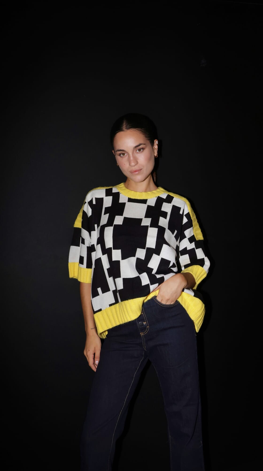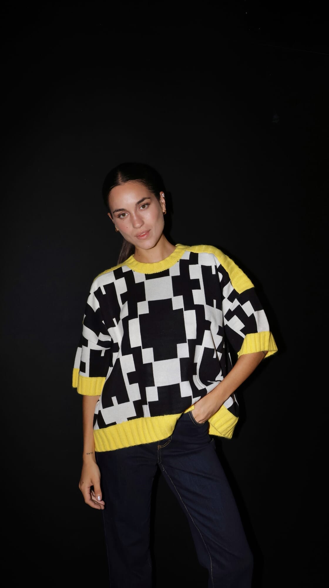 Buzo de punto manga corta con estampado simetrico y ribetes a contraste.
