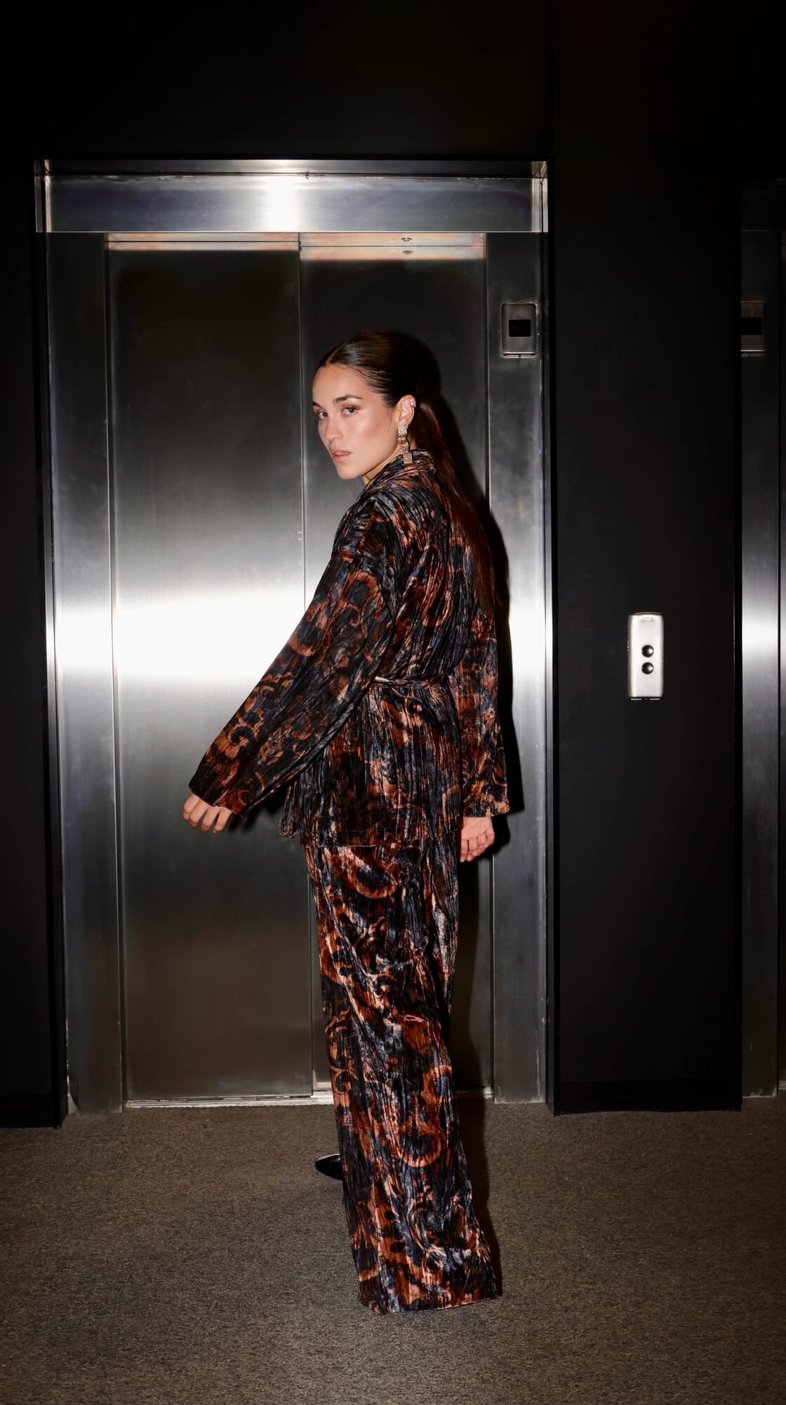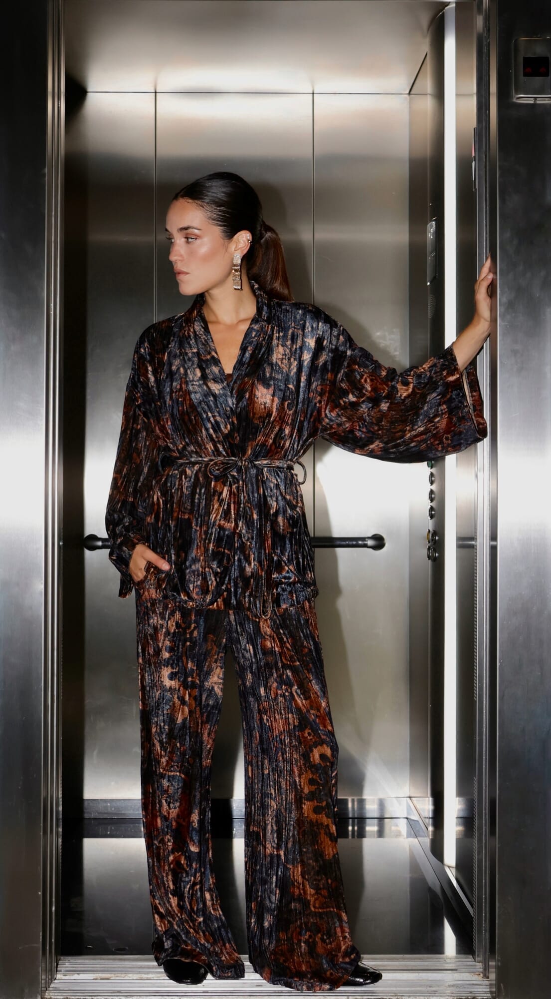 Chaqueta tipo kimono de terciopelo estampado cruzado con lazo.
