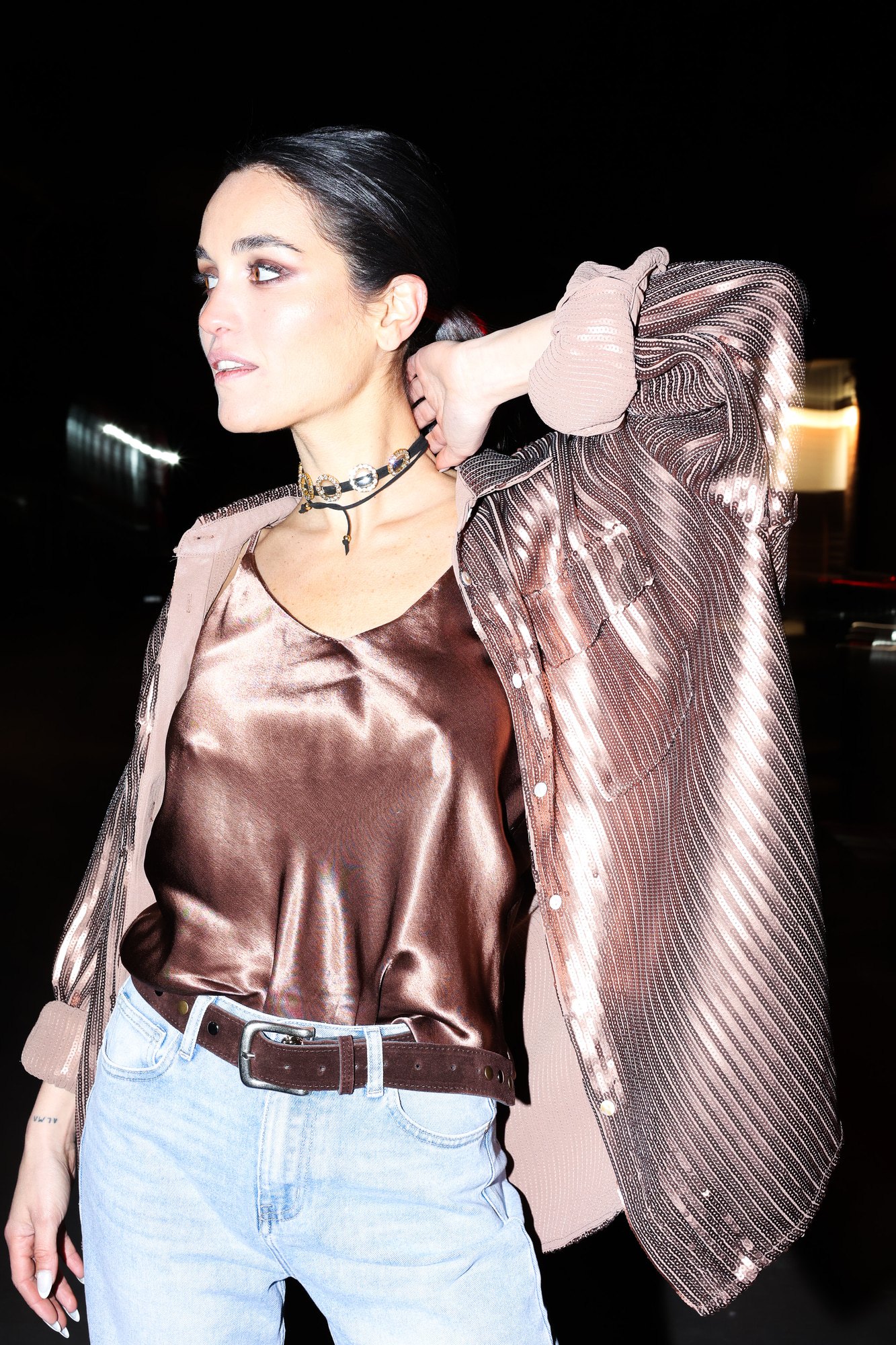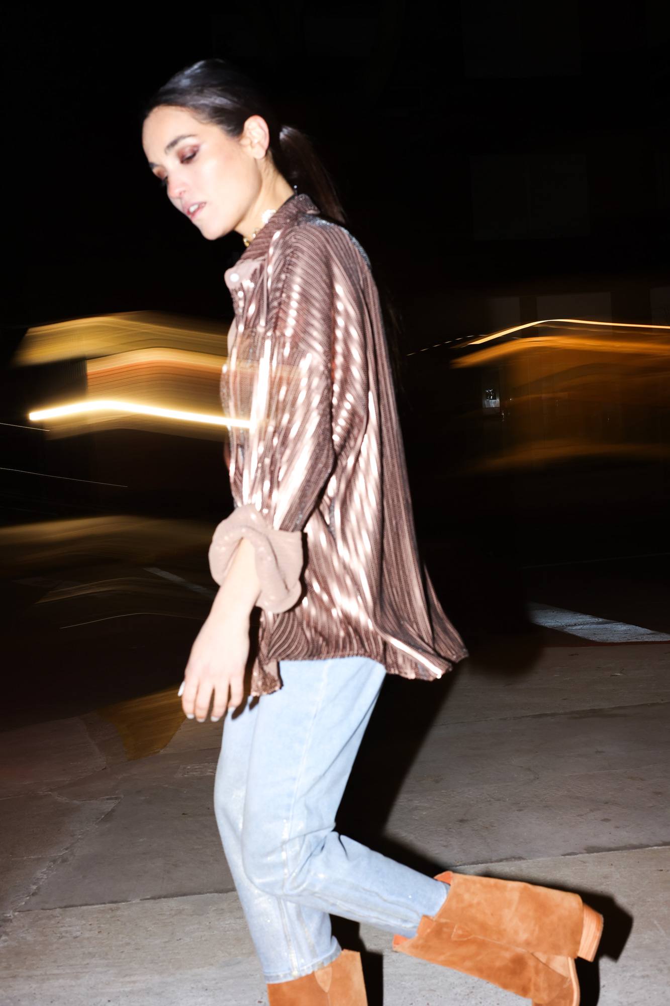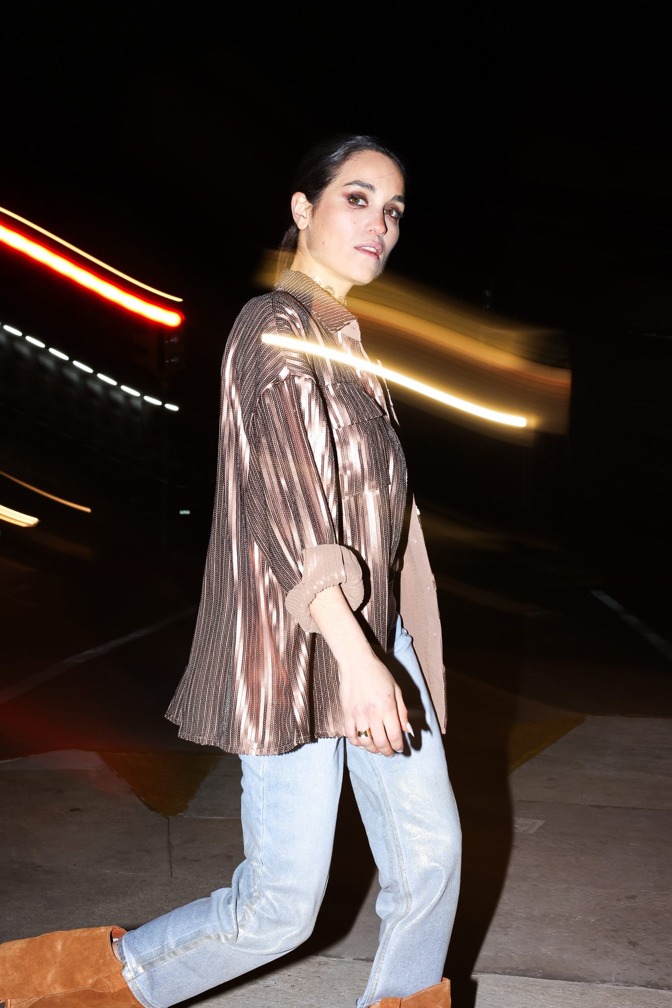 Chaqueta corte camisa de lentejuelas color cobre con acabado mate oversized.