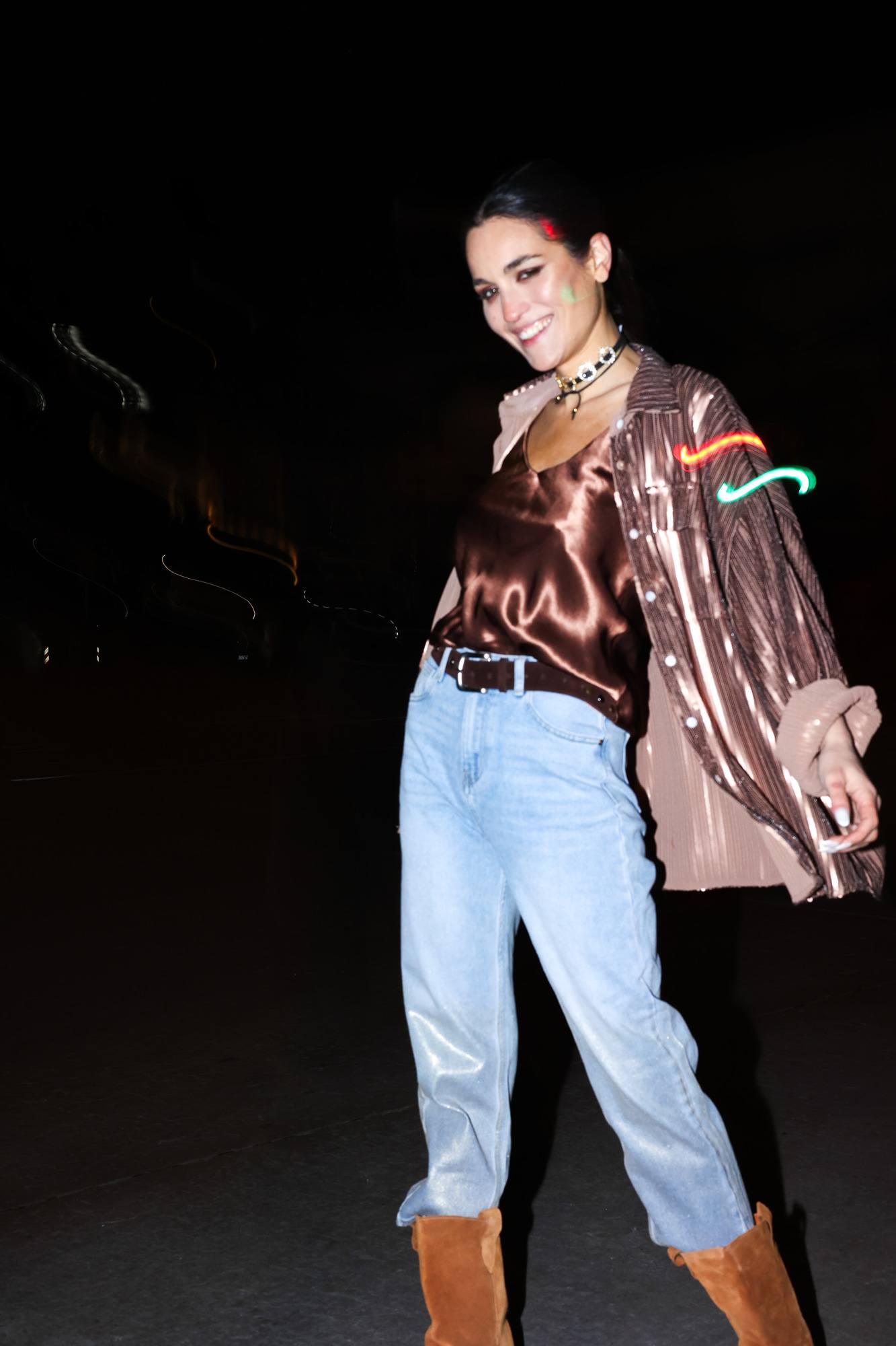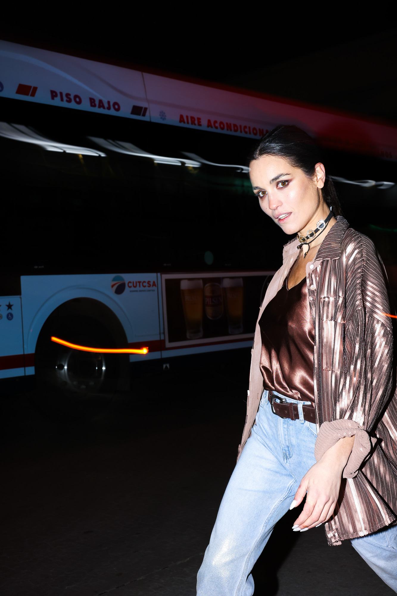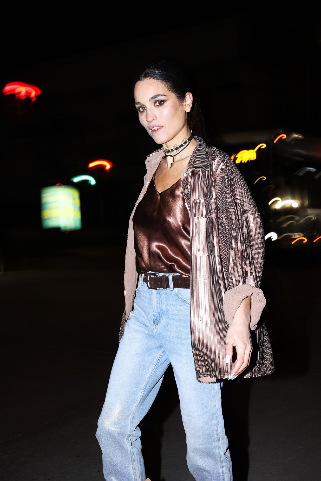 Chaqueta corte camisa de lentejuelas color cobre con acabado mate oversized.